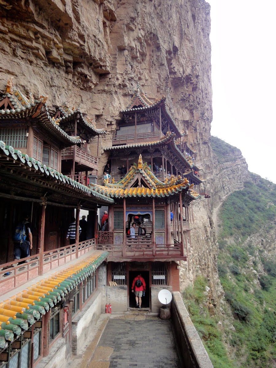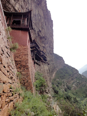 The most spectacular would be the Hanging Temple near Mount Heng. It was built 60 meters above the ground into a cliff. Seen from afar, it's like a relief carved on the surface of the mountain. Structurally, the buildings are supported on cantilevers. Horizontal holes were chiseled into the cliff, and square beams were inserted and wedged firmly in place. There are wimpy wooden poles under the buildings, but they were actually added after the buildings, more decorative (to make it look less scary) than structural.